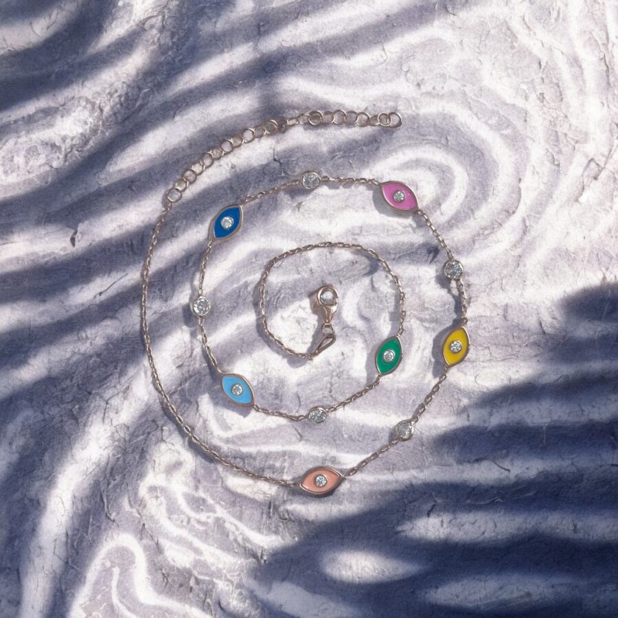 כסף טהור סטרלינג סילבר 925 בציפוי רוזגולד בעובי 2 מיקרון. העיניים מצופות באמייל בשלל צבעים ובמרכז כל עין זירקון קטן.