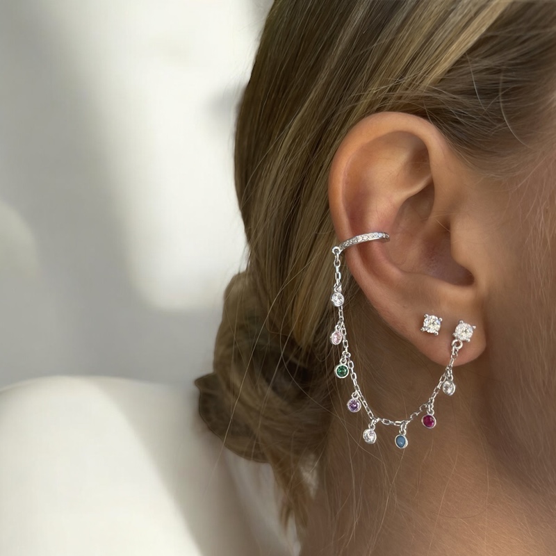 זוג עגילי זירקונים בקוטר 4 מ"מ כל אחד ומצד אחד מחוברת שרשרת זירקונים בשלל צבעים – לעגיל קליפ (ללא צורך בחור)