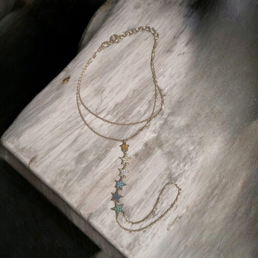 הצמיד עשוי מכסף טהור סטרלינג סילבר 925 בציפוי זהב אדום 14 קראט בעובי 2 מיקרון ובשילוב שישה כוכבים משובצים בזירקונים צבעוניים – כל כוכב בצבע שונה..